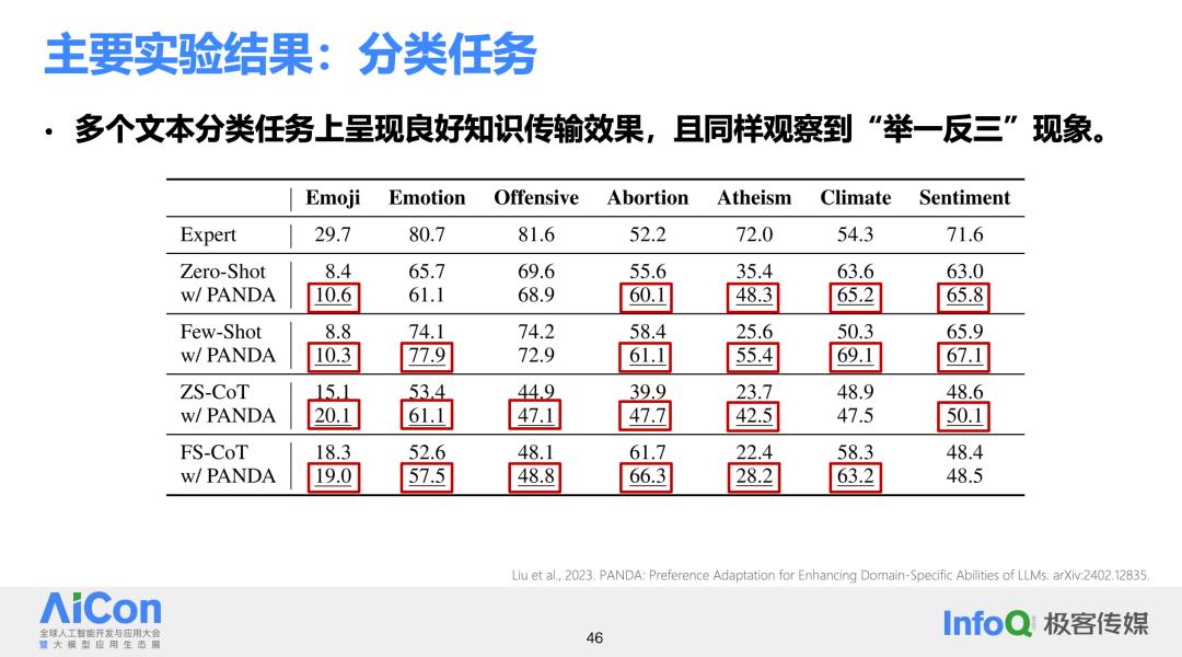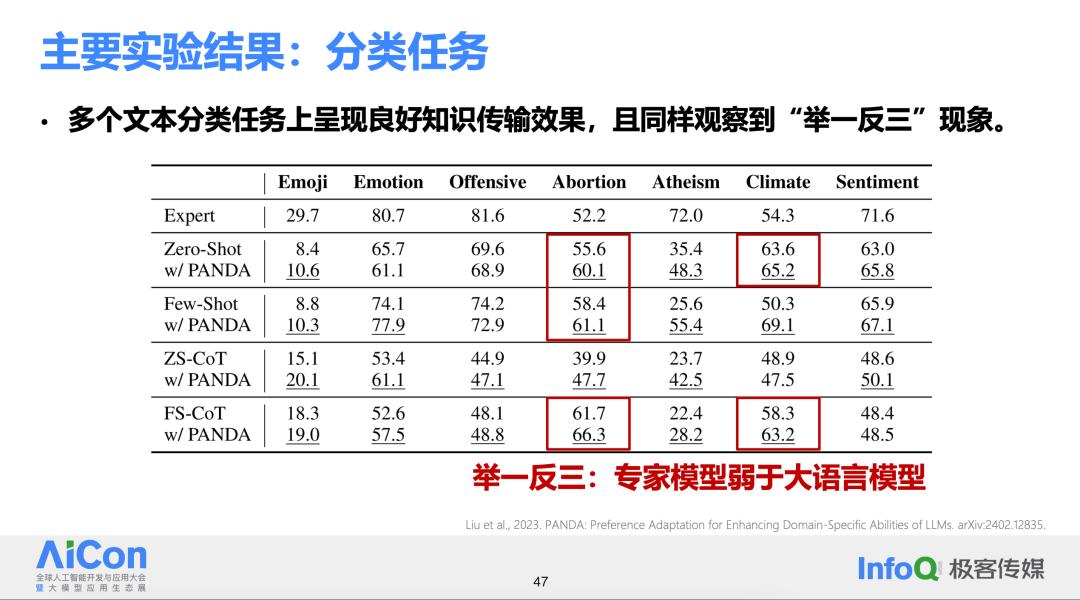 在文本分类等任务的实验结果表明,在大多数情况下,上述方法都能带来性能上的提升,这证明了知识传输的有效性。而且,之前提到的“举一反三”现象在这些任务中表现得更为明显,大模型能从专家模型中学习到额外的知识,使得其结果比未经知识传输时有更大的提升。