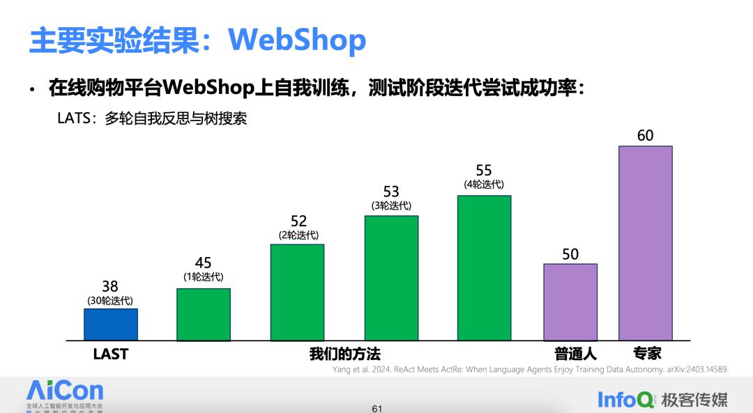 接下来,将测试转移至 WebShop 上,WebShop 是一个为研究目的而设计的简化版在线购物平台的具身环境。在此之前,一个名为 LAST 的系统在这个任务上表现优异,它引入了多轮自我反思、多次搜索等复杂机制。LAST 系统在这项任务上的得分为 38 分,作为对比,普通人在这项任务上的得分大约是 50 分,而专家可以达到 60 分。