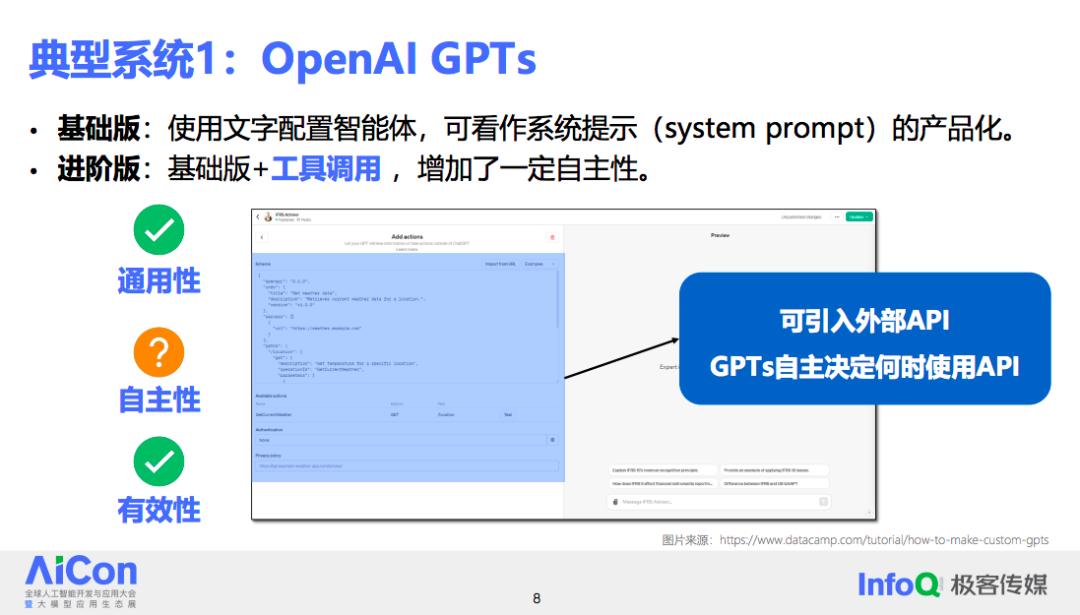 首先,以 OpenAI 推出的 GPTs 为例。基础版的 GPTs 通过文字配置智能体,并通过对话形式完成用户的需求,基本上可以将其视为一个系统提示的产品化工具。基础版之上,进阶版 GPTs 可以自主决定调用工具来满足用户的需求。