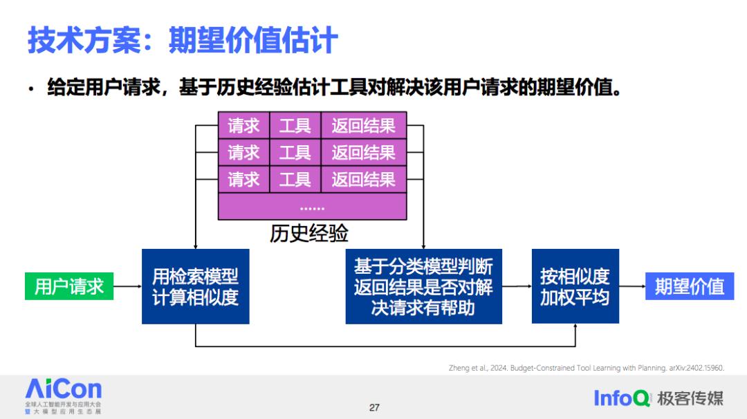 具体的,方案第一步是估计调用一次工具对于解决当前用户请求所能带来的正收益。过程大致如下:当收到一个用户请求时,查看历史数据,寻找与当前请求相似的案例,并分析这些案例中工具调用的情况。基于这些历史工具调用的数据,估算出调用某个具体工具可能为解决当前用户请求带来的收益。