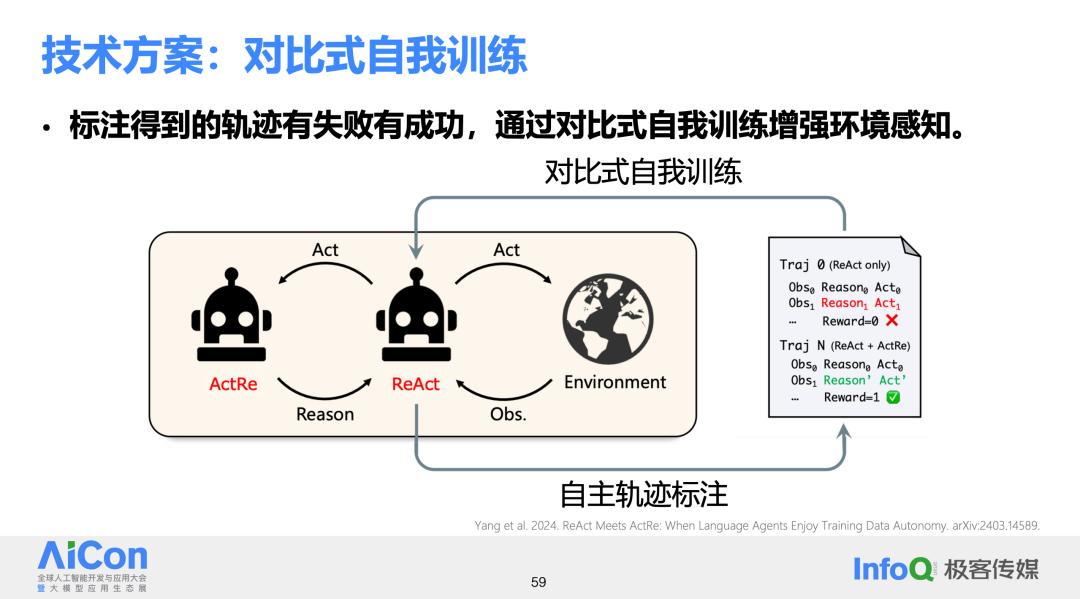 收集到数据后,用对比式自我训练的方法来进一步优化智能体模型。随着智能体模型的不断训练和优化,再次利用这些数据进行训练,进一步提升智能体的性能。如果智能体能够持续地通过这个流程进行训练,理论上它们的性能将不断得到提升。