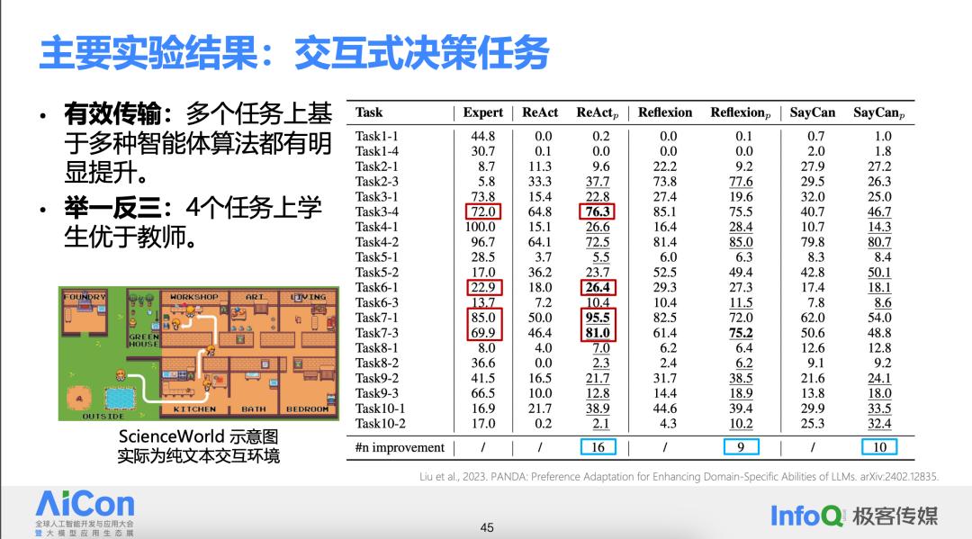 下图右侧的表格展示了使用该方法后的成果。其中,蓝线标出的部分显示了性能有所提升的任务种类数量,可以看出在多数任务上都有提升。更重要的是,在四个任务中,大模型的表现优于作为教师的专家模型。在知识蒸馏领域,很少见到蒸馏后的模型效果优于原始模型,即学生模型的表现超过了教师模型,这是一个非常罕见且令人鼓舞的结果。