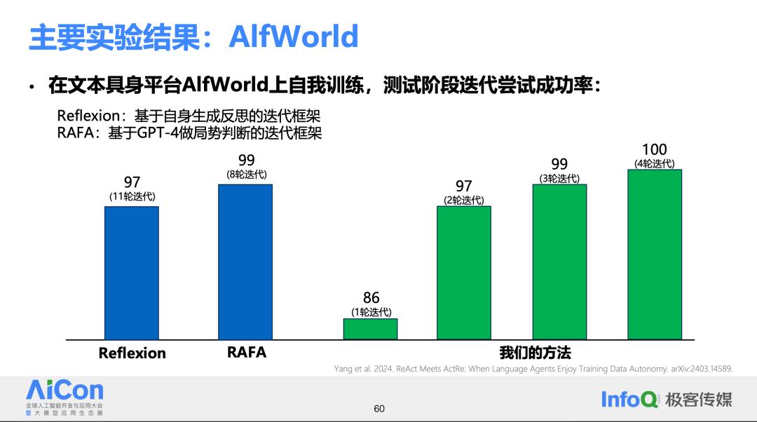 虽然上述描述的理想情况听起来非常美好,但还是要通过实验来检验实际效果。首先在名为 AlphaWorld 的文本具身平台上进行了实验。之前表现较好的是两个系统(下图左侧),在使用上述方法进行第一轮迭代后,得到的分数是 86 分。到了第二轮迭代,分数已经提升到了 97 分。到了第三轮,分数已经与其他参与基准测试的系统相比没有明显差距。到了第四轮迭代,问题已经完全得到解决,完成率达到了 100%。