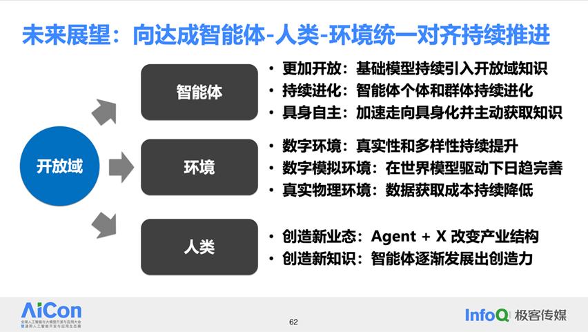 智能体是大模型解决更复杂问题的关键范式和抽象,目前,智能体急需全面向开放域拓展。在向开放域拓展的过程中,一个非常重要的原则是实现智能体、人类和环境之间的统一对齐。这一发展过程不仅令人充满期待,而且预示着一个充满潜力和机遇的未来。