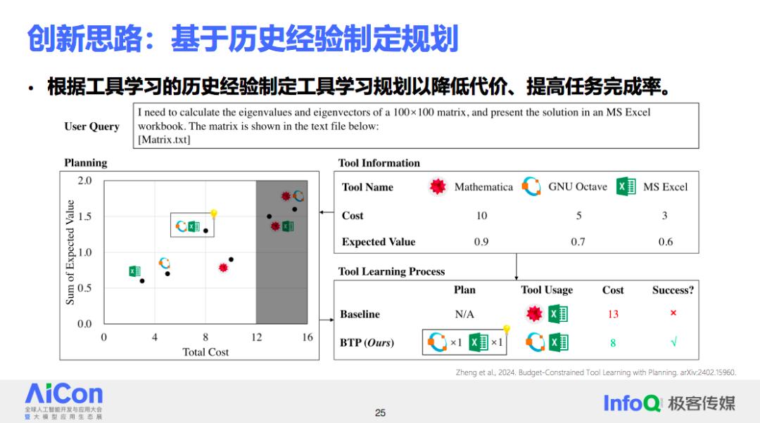 清华正致力于解决这个问题:利用大模型在以往调用工具时积累的经验,在接到新的用户请求时,不是立即调用大模型或工具,而是首先进行一个规划阶段。在这个阶段,对可能调用的工具以及调用次数进行预先粗略判断。