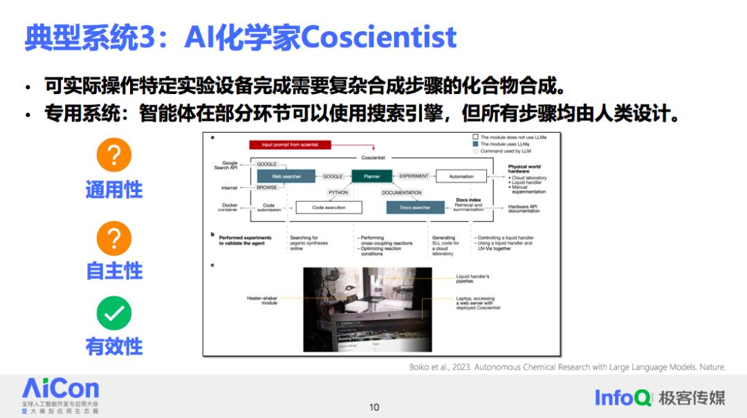 第三个具有代表性的例子是 AI 化学家系统,该系统能够通过大模型来控制真实的机器合成复杂的化合物。