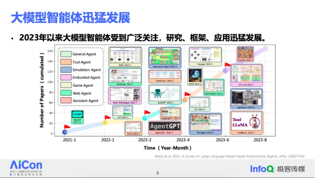 目前,大模型智能体正处于初级发展阶段,可以认为是一种介于 GPT-3 和 ChatGPT 之间的状态。一方面,公众已经看到其巨大潜力;但另一方面,从实际应用效果来看,它们还没有实现真正的阶跃。