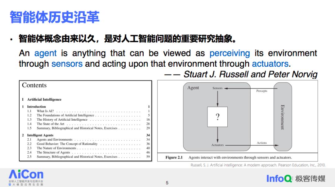智能体这一概念并非去年才出现,实际上它在人工智能学科中有着悠久的历史,一直是研究中的重要对象。著名教材《人工智能:一种现代方法》对智能体这样定义:智能体具备感知环境的传感器(Sensor),并通过这些传感器来感知周围环境;同时,它们还拥有执行机构,能够根据感知到的信息对环境做出相应的动作。