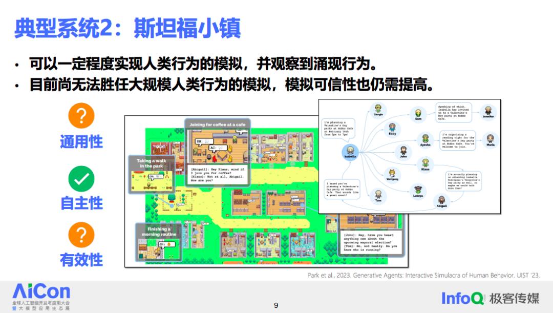 从这个角度来看,斯坦福小镇系统显然具有很高的自主性。然而,它也存在一些缺陷。首先,它目前还无法完成大规模的人类行为模拟;其次,它模拟出的行为的可信度仍然需要提高。因此,这个系统既不是通用的,其有效性也存在很大的问题。
