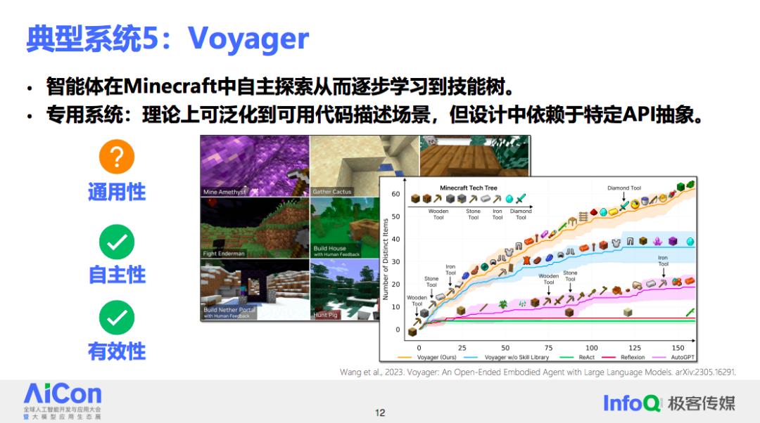 第五个典型系统是 Voyager,这是一个专门设计用于玩游戏的系统。它的设计目标是将智能体放入《Minecraft》这样的开放世界游戏中,让智能体在游戏环境中自主学习各种技能。