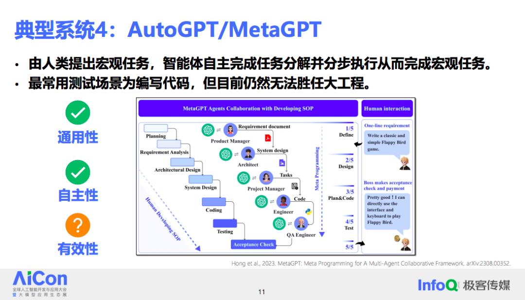第四个代表性的系统是 AutoGPT,它允许人类提出宏观任务,由智能体系统自行拆解、规划、逐步执行,最终完成整个任务。在设计层面上,这类系统的通用性非常强,自主性也表现得相当出色。