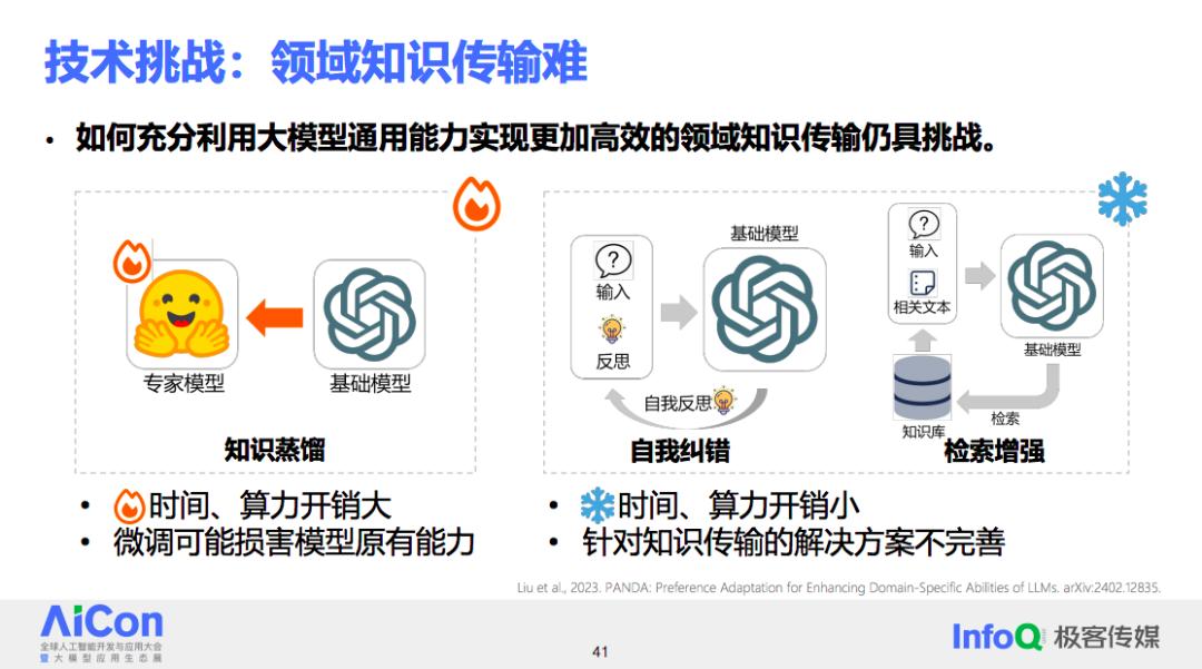 在讨论知识传输时,大家可能首先会想到知识蒸馏。传统的知识蒸馏通常是从强模型向弱模型传递知识,并涉及模型的微调。但在大模型时代,微调大模型需要巨大的时间和算力开销,并且可能会损害大模型原有的能力。另一种方法是最近一年多非常流行的非参数或半参数方法,如 Prompt 或检索增强。这些方法不需要调整模型,而是通过特定的形式将知识应用于模型的使用过程中。与大模型的知识蒸馏相比,这些方法的时间和精力开销显著减少。但问题是,这些方法最初设计时并非针对知识传输,如果直接用于知识传输,效果可能并不理想。
