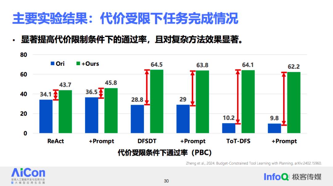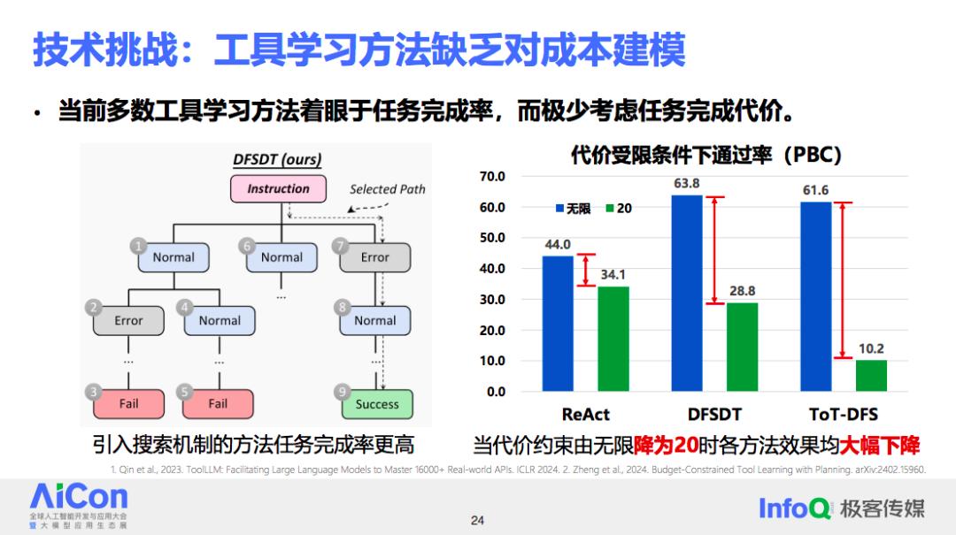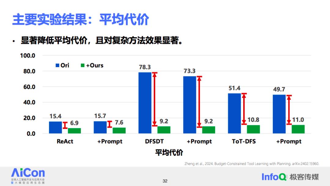 以一个复杂的工具学习方法为例,该方法通过引入搜索机制来解决问题,尝试多种解决方案并对每个分支进行可能性评估,以找到最佳方案。如果不考虑智能体运行的代价,设计复杂的系统可能会提高任务完成率。然而,一旦对代价进行限制,比如限制在 20 单位成本内完成任务,超出这个限制则认为任务未完成,那么现有方法的性能会有显著下降。