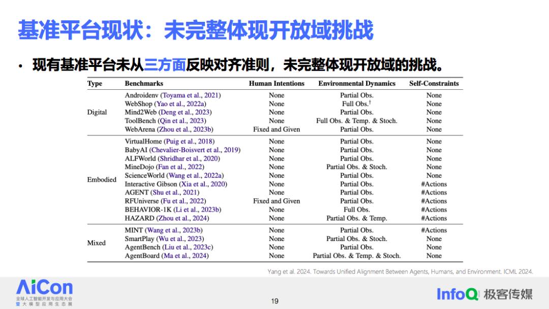 要了解当前的情况,可以从智能体评价基准平台即 Benchmark 着手。从目前的数据来看,现有的测试基准没有一个能够全面考虑三方对齐。评估智能体在开放域中的表现需要更全面从三方统一对齐出发建设的基准。