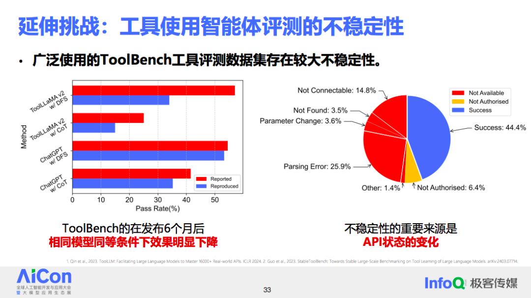 Toolbench 是一个著名的工具评价基准,包含了上万个线上的真实工具。下图中,红线代表 Toolbench 刚发布时系统的效果,蓝线则表示在不改变任何条件的情况下,6 个月后再次测试的结果,效果有大幅下降。这表明,尽管方法没有变化,评价结果却受到了影响,这是基准本身的问题。为什么会出现这种问题呢?正如之前提到的,许多 API 的状态发生了变化,接近一半的 API 不再可用或者参数发生变化,造成了很大的影响。