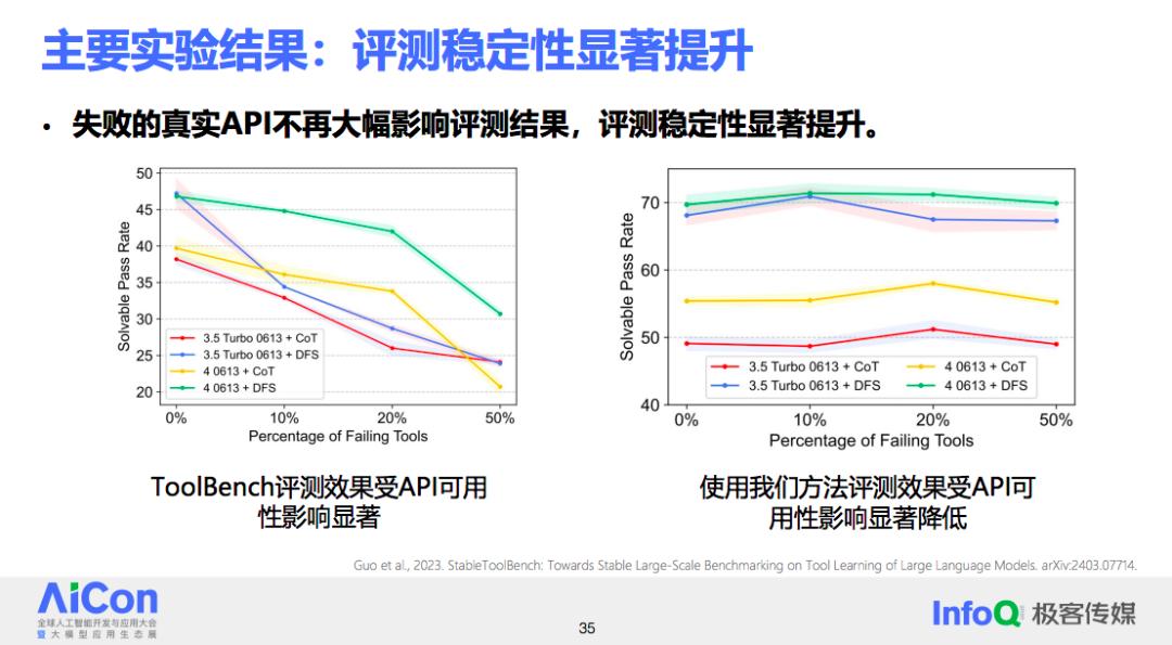 如下图左侧所示,在引入缓存系统和 API 模拟器这两个机制之前,Toolbench 的评价效果会随着 API 不可用比例的增加而下降,即评价值持续降低。右侧图显示,当采用这种方法之后,即便面对 API 不可用的情况,评价的数值也变得更加稳定。
