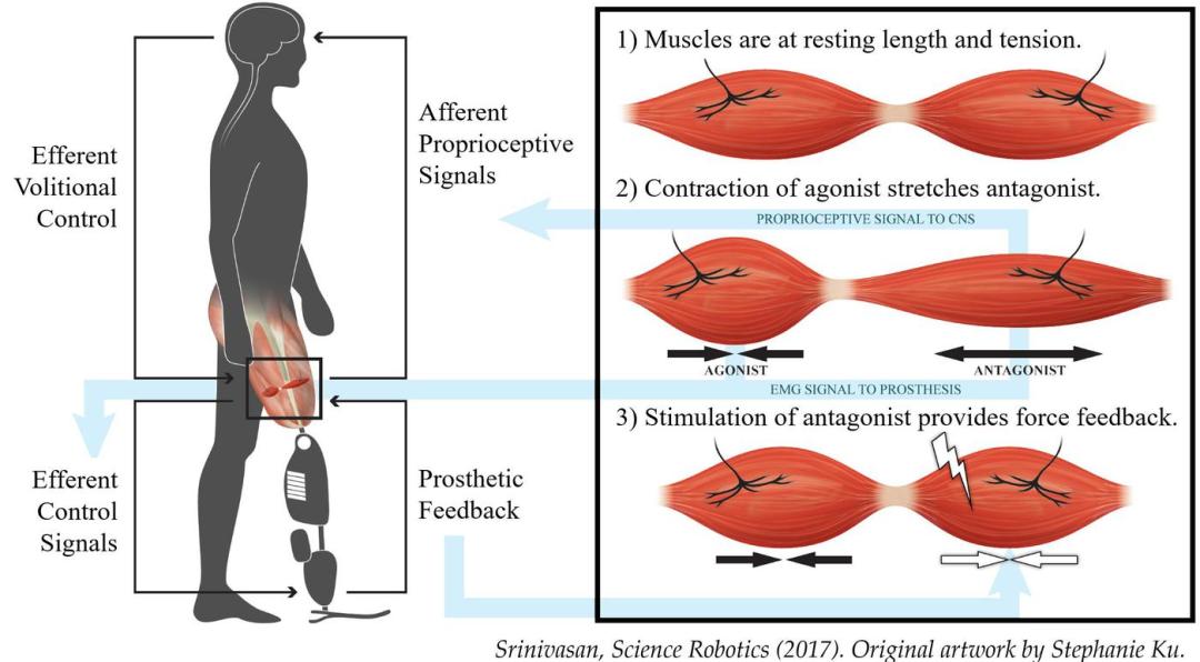 人类的大多数肢体运动由轮流伸展和收缩的成对肌肉控制。在传统的膝下截肢过程中,这些成对肌肉的相互作用被打乱。这使得神经系统很难感知肌肉的位置和收缩速度 —— 而这些感觉信息对于大脑决定如何移动肢体至关重要。