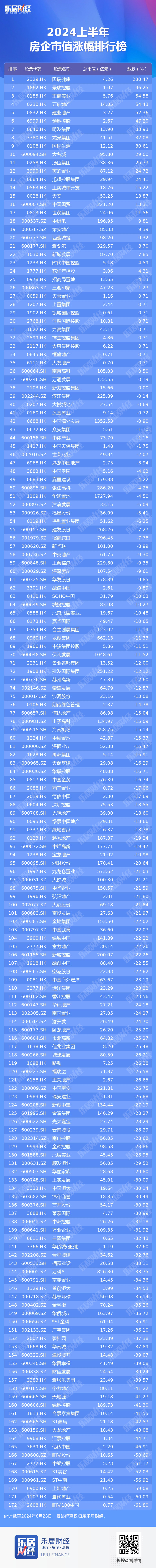 6月30日,乐居财经发布《2024上半年房企市值涨幅排行榜》。该榜单对172家房地产上市公司的市值进行了汇总,并以2024年初至6月最后一个交易日的市值涨幅进行了由高到低的呈现,以供大家参考。