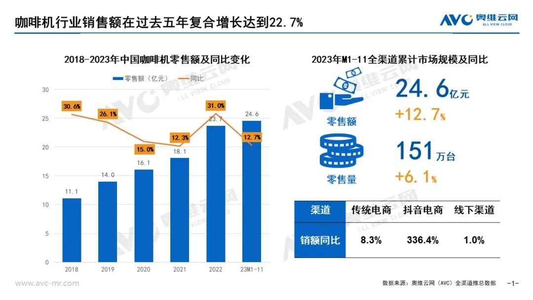 据奥维云网推总数据显示,咖啡机行业销售额在2018-2022年五年间的复合增长率达到22.7%,2023年1-11月行业整体规模达24.6亿元,同比增长12.7%。
