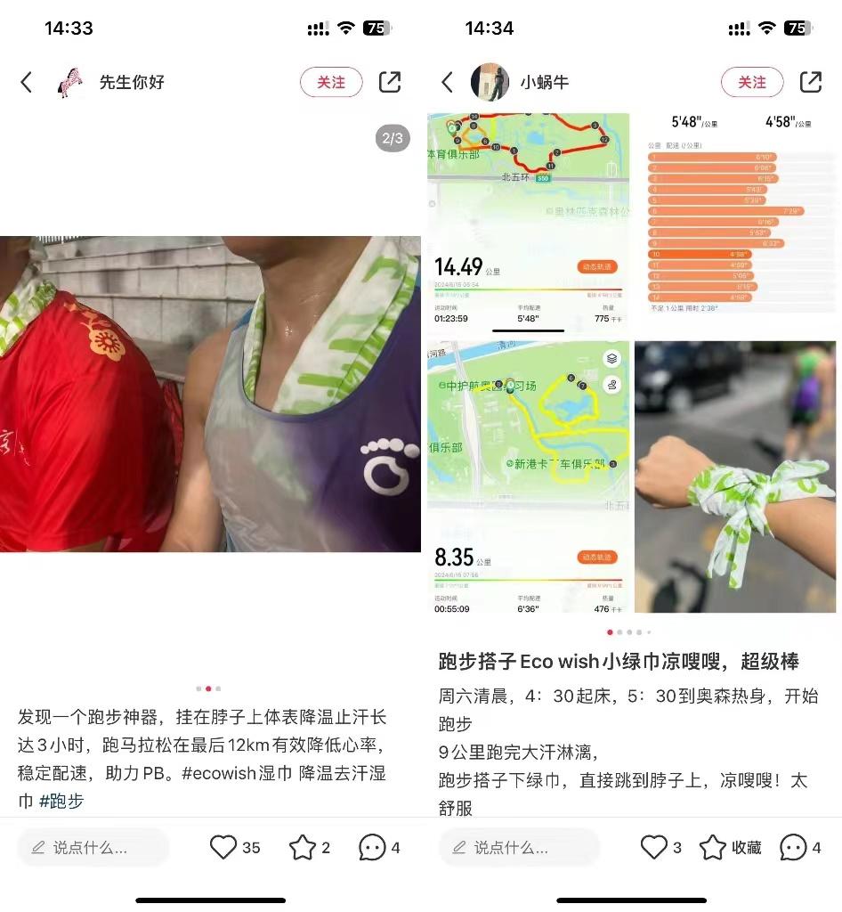 Eco wish 选择的是马拉松,这类长距离耐力运动对降温续航、稳定心率非常敏感,痛点明显,产品功效能在这里更好得到展现。他们与跑团合作,将自己定位为跑步搭子,是“马拉松最后12公里续航神器”,也是“马拉松精英选手同款 pb(个人最好成绩) 神器”,慢慢蔓延至健身房和日常场景。