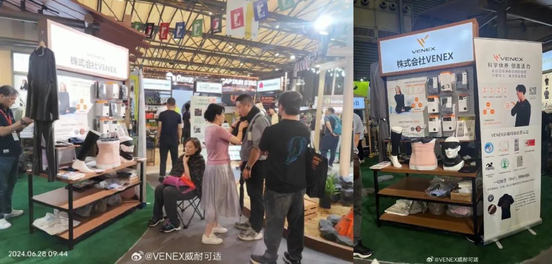 日本休养衣品牌 VENEX 也出现在了 ISPO 展会现场。它主要通过材料创新来提升睡眠质量,原理是将以纳米白金为主原料开发的特殊素材“PHT”捻入纤维中,使布料发射出微弱的电磁波,刺激人体的树突状细胞,使“副交感神经”处于优势地位,从而放松肌肉,促进代谢。
