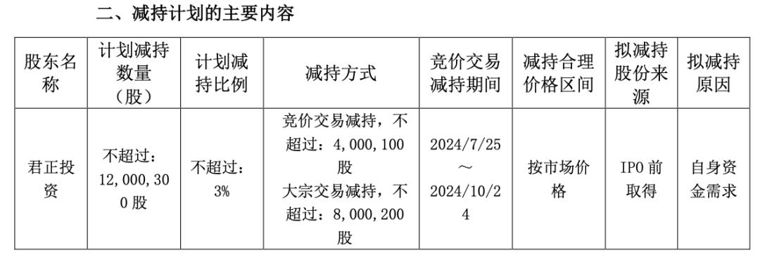 据东鹏饮料最新公告,公司于2024年7月1日收到股东天津君正创业投资合伙企业(有限合伙)(以下简称:君正投资)的《减持计划告知函》,君正投资因自身资金需求,计划通过集中竞价和大宗交易方式减持公司股份不超过1200万股,占公司总股本的3%。减持将在公告之日起十五个交易日后的三个月内进行。