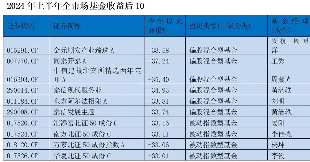 排在倒数第二的同泰开泰则是败在了北交所的股票上。其基金经理王秀在一季报中表示,北交所有很多专精特新的公司,许多公司都是细分领域的龙头,未来成长性较好。回调后性价比更高,具备更大的投资价值。继该基金一季度下跌26%之后,二季度继续下探15%。而在今年年初更换基金经理之前,该基金主要在光伏、芯片、医药等成长领域轮动配置,2023年下跌28%,2022年下跌31%。