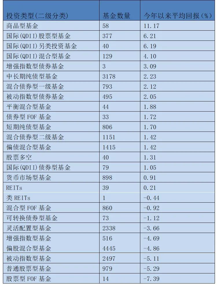 从上表可以看到,商品型基金上半年以11%的平均收益遥遥领先;其次是QDII基金,平均收益在4%-6%之间;接着是债券基金,平均收益在2%-3%之间;国内主动权益基金平均收益整体告负,平均下跌5%;平均收益最差的是股票FOF(Fund of Fund,基金中的基金),14只股票FOF平均跌幅超7%。