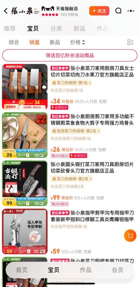 当然,反过来看,这三款热销产品被标注“已售20万+”“已售10万+”“已售9万+”,又分别位于“菜刀热销榜”和“厨房剪刀热销榜”的1、2名,证明张小泉在中国市场仍属于接地气的实力派。