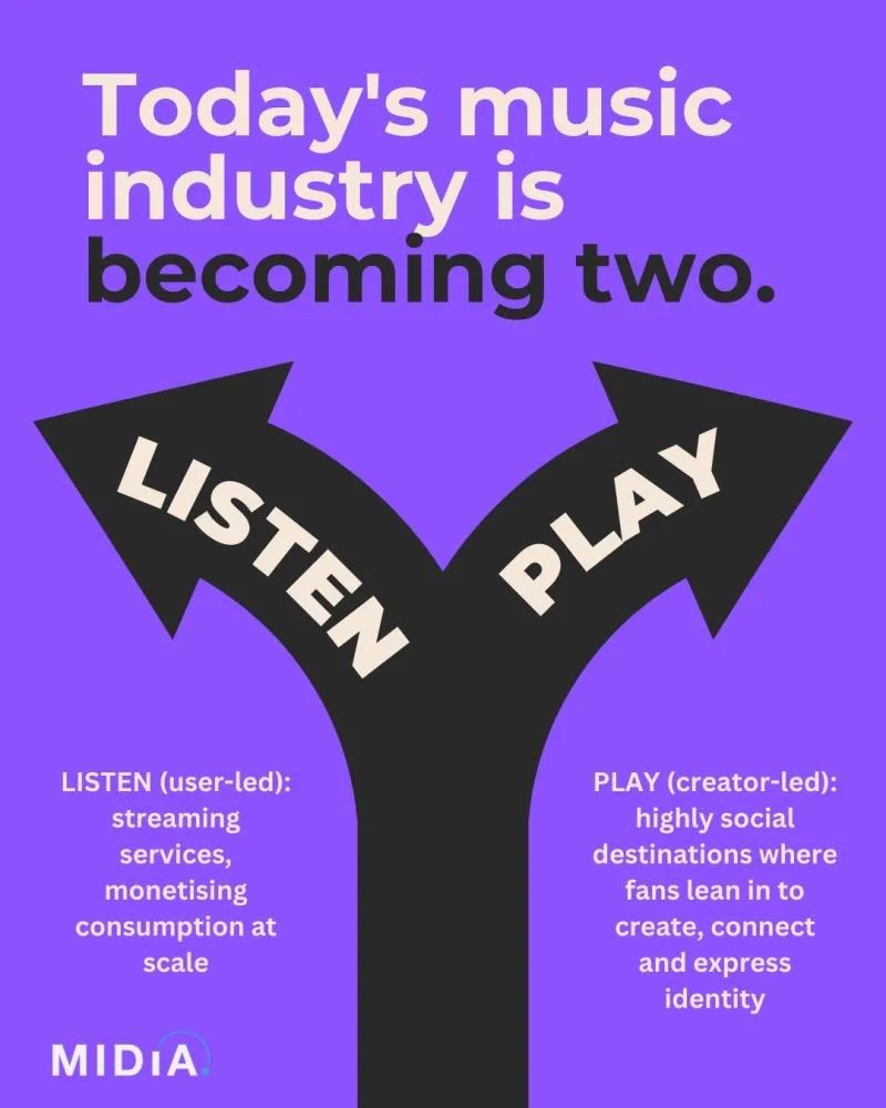 今年4月,MIDiA发布了报告《Bifurcation theory:How today’s music business will become two》(《分叉理论:当今的音乐行业的两个发展方向》)中提到,音乐产业的未来增长点不仅仅在于消费,还包括内容创作,至于是选择刺激消费还是滋养创作,则是平台方至关重要的一环决策。