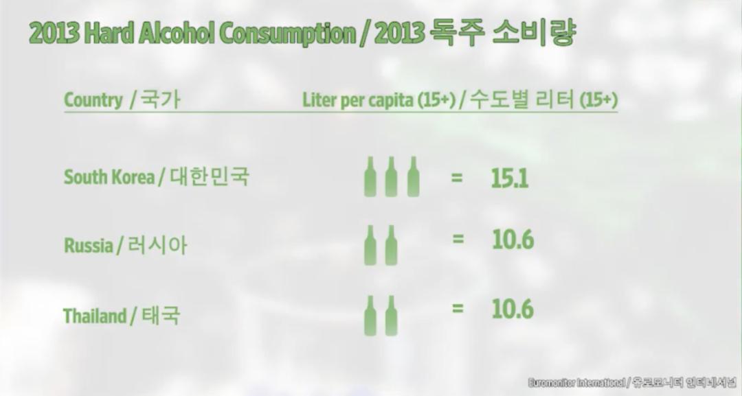 2014年的世卫组织数据显示,韩国人均酒精消费位列全球第十三名,是亚洲最能喝的国度。