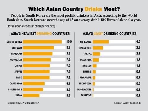 人人都听过俄罗斯人能喝的传闻,但数据显示,韩国人比俄罗斯人喝得还多。