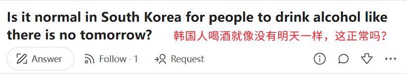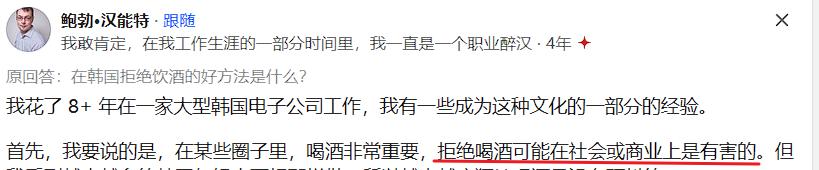 评论区的韩国网友热情地告诉他,如果你实在不想喝,就可以不喝——毕竟你不是归人,只是过客。