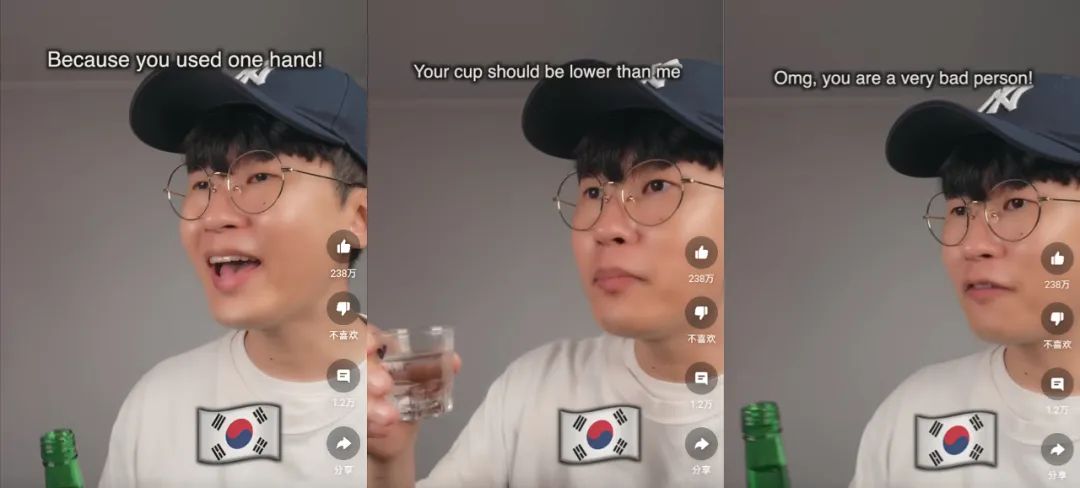 在博主@MyKoreandic 的情景模拟中,美国小伙先后因为用一只手接酒,杯口放得比别人高等鸡毛蒜皮的原因,被怒斥为不懂礼貌的 very bad person: