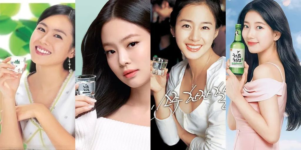 为烧酒代言,甚至已经成为韩国女星的国民度认证。从李英爱、金泰熙到 IU、Jennie,咖位不够,还真没资格端起真露和初饮初乐的绿色酒瓶。