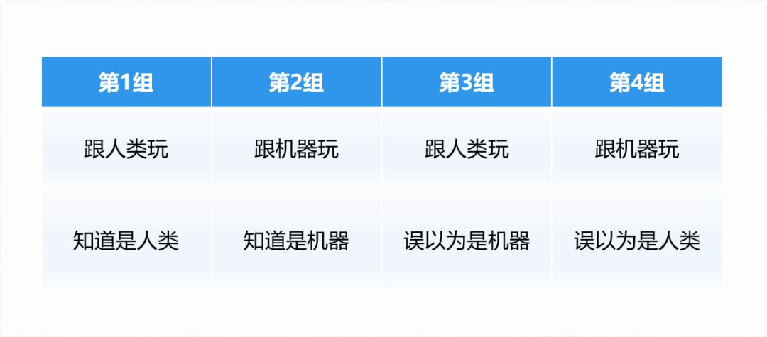 实验人员构建了四个组别:与他们知道是人类的人一起玩;与他们知道是机器人的机器人一起玩;或者与他们认为是机器人的人一起玩,以及与他们认为是人的机器一起玩(如表1所示)。