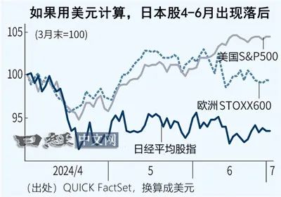 日经平均股指4~6月下跌2%,落后于上涨4%的美国标准普尔500指数等世界主要股市。在此期间,日元贬值也在加剧,以美元计算,日本股票的估值进一步萎缩。也有观点认为,目前的涨势只是“截至6月的疲软”的报复性反弹。