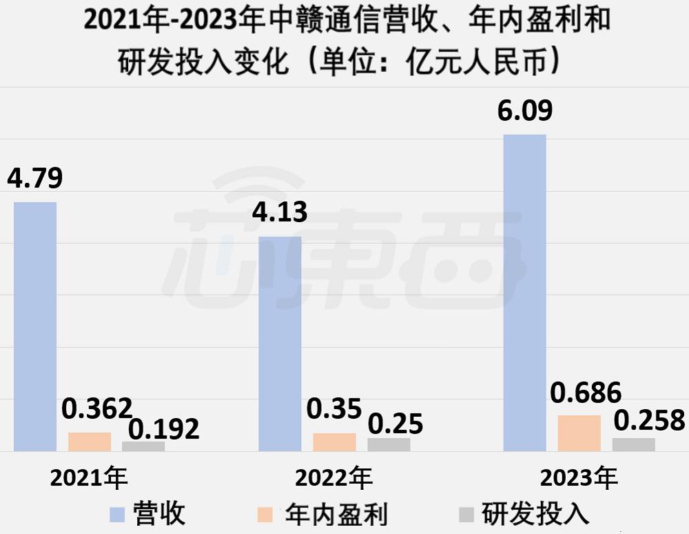 2021年-2023年,中赣通信的年营收分别为4.79亿元、4.13亿元和6.09亿元,年复合增长率为12.8%。