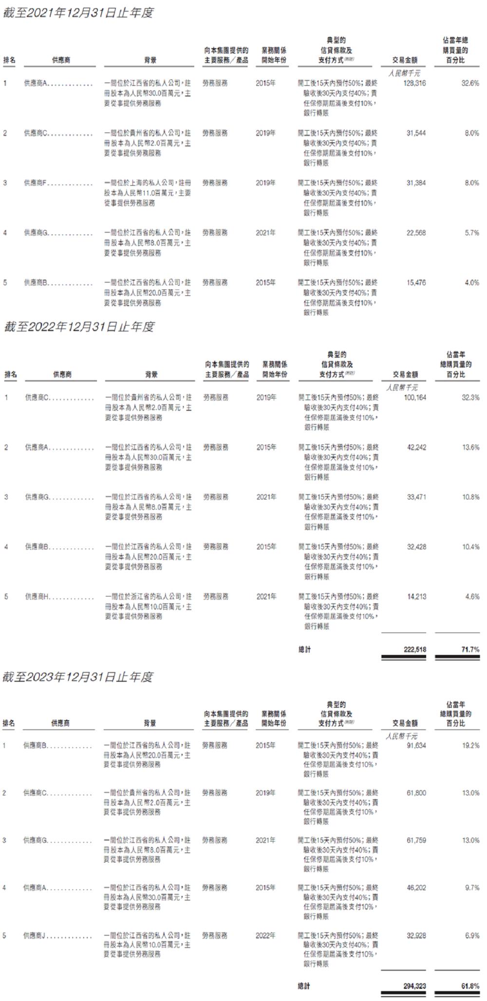 中赣通信的供应商主要包括劳务供应商和软硬件供应商。劳务供应商主要负责为项目提供劳务和配套建筑材料。2021-2023年间,中赣通信历年的五大供应商均为劳务服务企业。这3年间,产生于前五大供应商供应商的采购成本分别为2.29亿元、2.22亿元和2.94亿元,分别占当年总采购量的58.3%、71.7%和61.8%,占比较高。