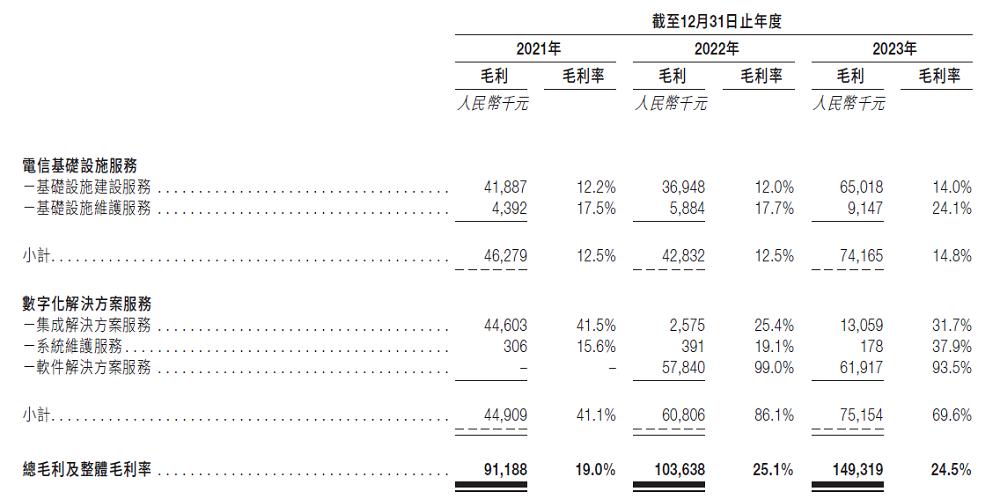 较高的毛利率或许与中赣通信的数字化解决方案业务有关。这部分业务虽然在中赣通信的总营收中占比不高,但是毛利率却要显著高于电信基础设施服务。2022年,中赣通信启动的软件解决方案服务业务的毛利率在第一年达到了99%,而在2023年也维持着高达93.5%的毛利率。