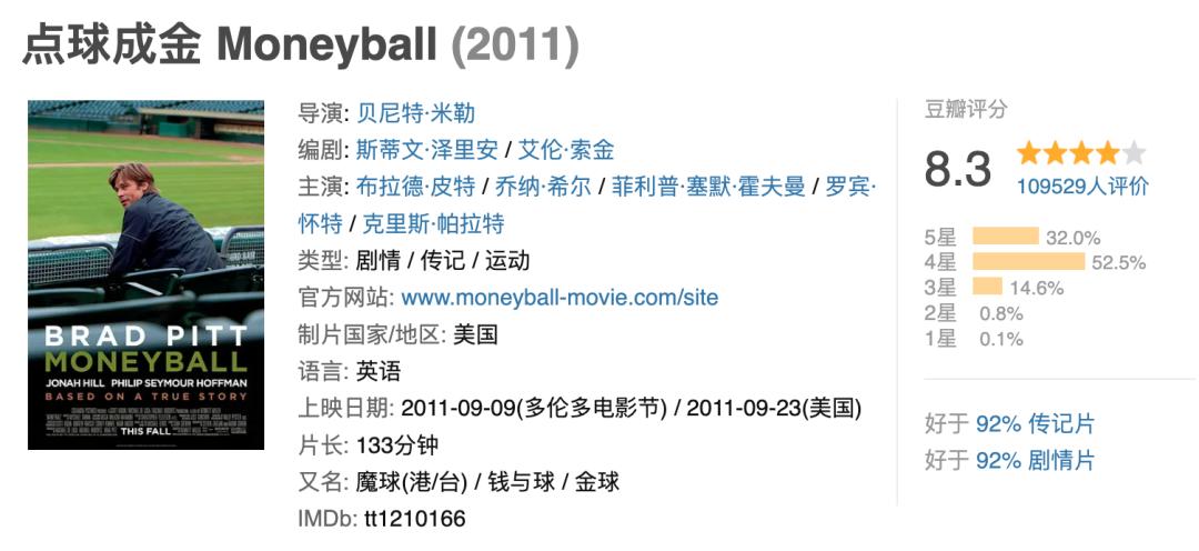 贝内特·米勒执导,布拉德·皮特和乔纳·希尔主演的电影《点球成金》(Moneyball),这部电影讲述了一个真实的故事:奥克兰运动家棒球队的总经理比利·比恩在预算有限的情况下,与耶鲁大学经济学毕业生彼得·布兰德合作,革命性的利用“棒球统计学”(Sabermetrics)来评估球员并组建球队,在没有明星球员的情况系创造了MLB的美联连胜纪录并打入季后赛。