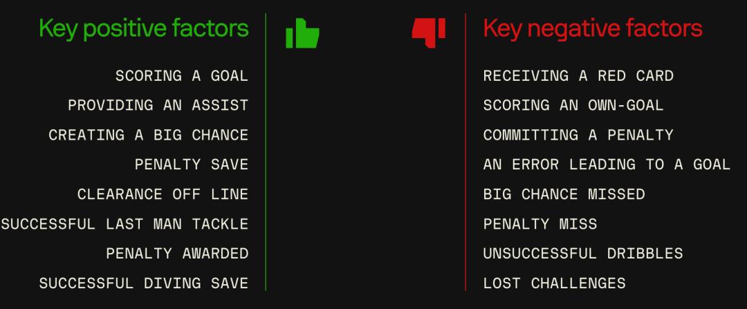 虽然二者都未公开过自己的算法,但是通过媒体报道还是能够看到一些端倪,WhoScored评分只在赛后更新,倾向于整场比赛完结后,将球员的每个动作的数据细节进行彻底分解,并赋予某些重点动作更高的权重(如关键传球、成功拦截、过人等),对于一些负面动作(如失误、犯规、红黄牌)的惩罚也会更加严厉。比如科比-梅努在比赛中吃了一张黄牌,在WS的评价体系里扣分就会更多。而福登多达21次的丢失球权,也许就成为他评分较低的原因。