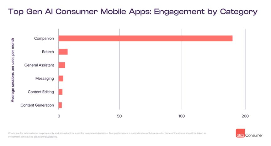 据a16z榜单,AI伴侣已成为GenAI的主要用例之一。已有数百万人与聊天机器人建立了关系。对于移动端的AI伴侣App,用户参与度异常之高。最成功的产品甚至已经是用户日常生活的重心,就像给朋友发短信一样普遍。
