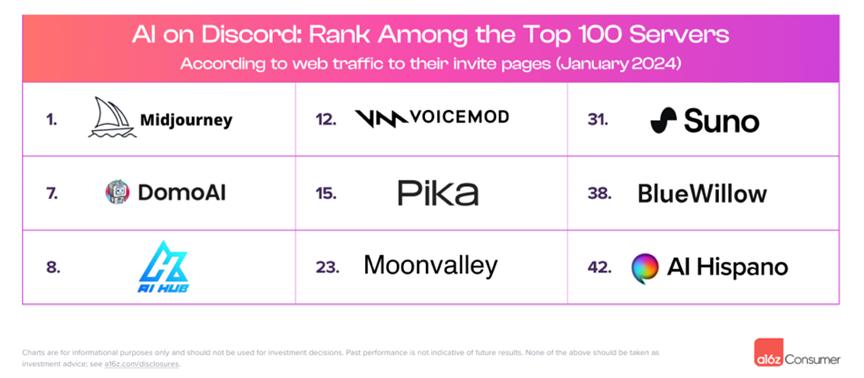 截至2024年1月,在Discord平台上的AI产品中,Midjourney排名第一。题外话,朱啸虎不看好Midjourney。原因是和移动互联网一样,To C应用必须刚需、高频,长远才有机会守得住,而Midjourney的To C应用太低频。