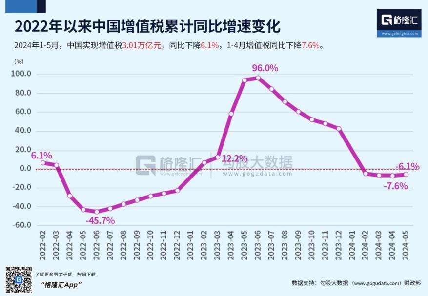 2024年1-5月,中国实现增值税3.01万亿元,同比下降6.1%,1-4月增值税同比下降7.6%。