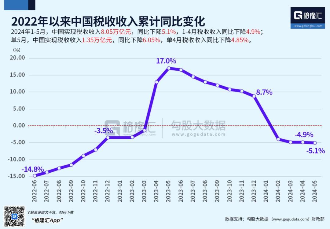2024年1-5月,中国实现税收收入8.05万亿元,同比下降5.1%,1-4月税收收入同比下降4.9%;单5月,中国实现税收收入1.35万亿元,同比下降6.05%,单4月税收收入同比下降4.85%。