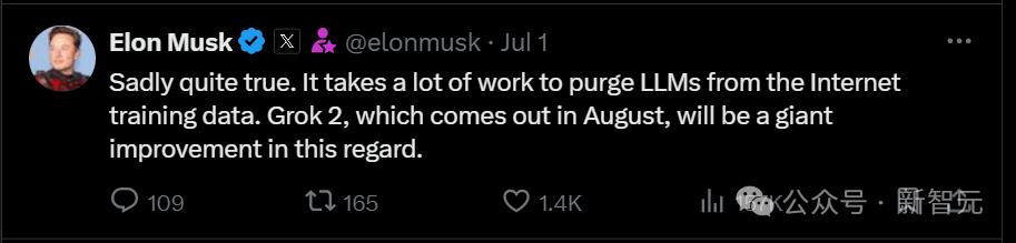 他发帖表示,从互联网语料中清除掉LLM合成的错误数据,形成高质量数据集需要大量的工作,而8月份推出的Grok 2将是这方面的巨大进步。