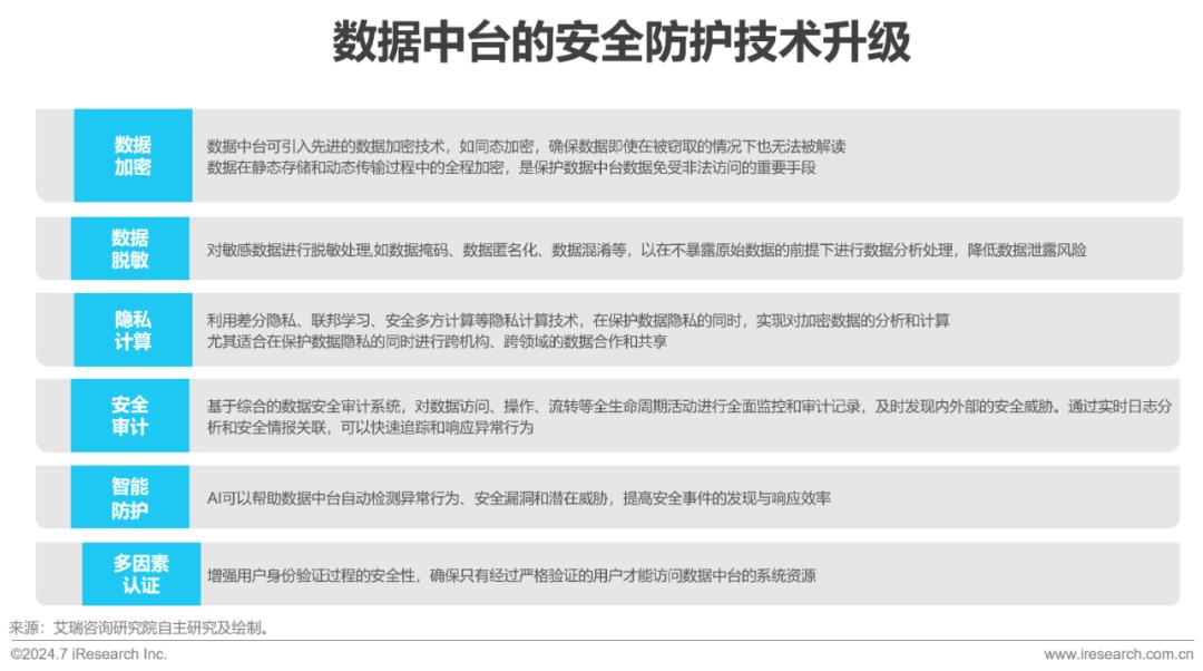 受宏观经济影响,部分企业减少了对数据中台等回报周期较长的项目的建设投资。艾瑞咨询预计,数据中台市场规模将保持相对平稳,2023至2028年的复合年增长率约为7%。尽管如此,在企业数字化升级的持续推进下,加之数据要素相关政策和数据保护相关法规的逐步完善,数据中台将在企业数据管理、利用、交易和流通等方面将扮演更加关键的角色,成为推动市场回暖的重要支撑。此外,大模型等前沿AI技术的快速发展,进一步增强了企业对数据中台的依赖:数据中台不仅为AI模型的训练和应用提供了大量高质量数据支持,还因大模型在语义理解、逻辑推理等方面的突破性进展显著提升了用户体验、丰富了产品功能。