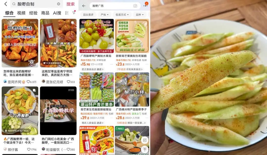 酸嘢自广西出发逐渐辐射全国,目前市场连锁化程度并不高,部分买不到酸嘢的食客,开始自己DIY。在抖音,一条自制酸嘢的教程获得了6万的点赞量和2.8万的收藏;淘宝一家售卖“预制”酸嘢的店铺,已有1万+人付款;拼多多商铺中新鲜青芒、酸嘢调味料等的销量也十分可观。