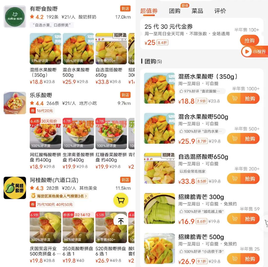 在北京,北新桥附近的乐乐酸嘢,价格为29.8元/500g;顺义华联的夏果语自选价格略贵,为33.6元/500g;如果在吃糟粕醋火锅时抢到团购券,即可享用19.9元一份的酸嘢芒果花。